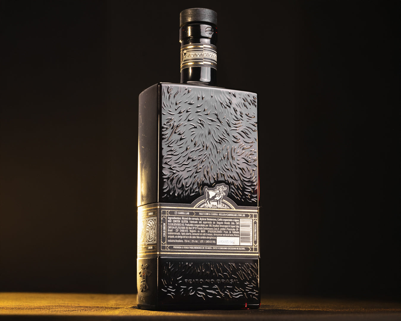 Em formato de prisma retangular, a garrafa de Cabra Lab tem vidro âmbar e alguns detalhes em alto relevo.